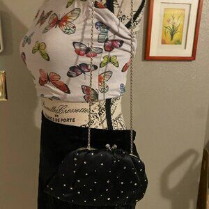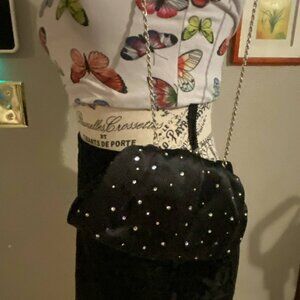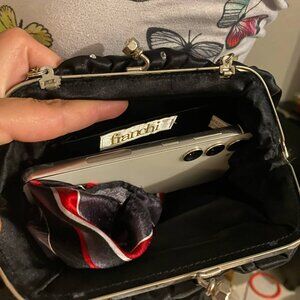 Y2k Black and silver franchie diamanté clutch bag with chain strap. Spacious enough for the essential phone wallet keys. Includes this red and black silk handkerchief