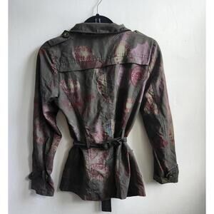 Features: Unique green jacket with travel stamp-inspired allover print in pink, red, yellow, and blue tones. Double breasted closure with 6 front buttons. Self-tie waist belt that is fully removable. Two front patch pockets with button flap closures. Adjustable button cuff straps. Military/utility-inspired style. Lightweight cotton or cotton-blend construction (no visible material content tag).