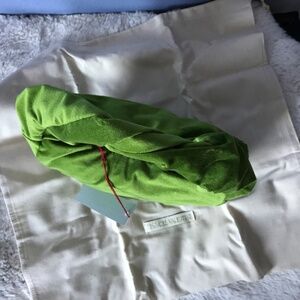 Beautiful green velvet Francis Valentine mini bag will never go out of style. The slouchy hobo style has a single twist handle and a secure top zipper. Inside is lined and has one inside slip pocket. The bag has a height of 4.75”, length of 8.5” and a width of 3”. The handle has a 6” drop and fits perfectly in your hand or over your arm.