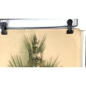 A print created using flat stones or metal plates. The artist creates a lithograph by drawing an image directly onto the printing element using materials like lithograph crayons or special grease pencils. After
