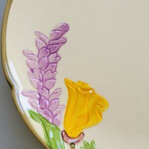 Vintage Franciscan Poppy salad plate from the 1950s features hand-painted yellow and purple floral design. A discontinued collectible perfect for replacement or display.