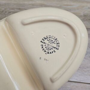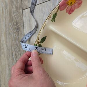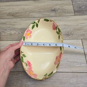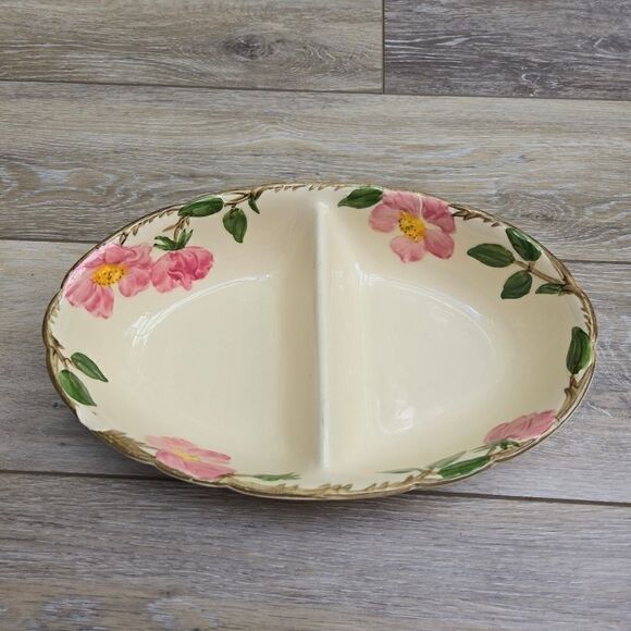 Enhance your dining experience with the Franciscan Desert Rose divided serving dish. Made from cream-colored china, this exquisite dish features a delicate pattern of pink roses and green leaves , adding a touch of elegance to your table. Measuring 11" x 7", it offers ample space to beautifully display and serve your favorite dishes. Whether you're hosting a formal dinner or a casual gathering, this versatile dish is perfect for organizing and presenting a variety of appetizers, condiments, or desserts. With its timeless design and practical functionality, the Franciscan Desert Rose divided serving dish is a must-have addition to your tableware collection. Treat yourself and your guests to a memorable dining experience with this stunning serving dish.