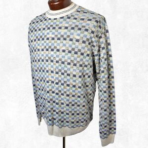 Franco Danti men's size LARGE crewneck sweater is in excellent condition. Soft textured checkerboard pattern in shades of blue, green, tan and ivory. 52% Cotton, 48% Acrylic; Hand Wash.