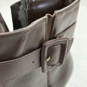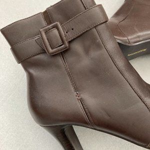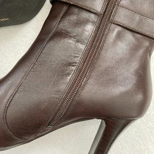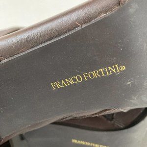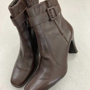 Franco Fortini "Leigh" brown leather heeled ankle boots. Size 8.5. These fabulous ankle boots have a square toe, side zipper and buckle detail. The heel height is 3". They are in very good condition, but have some cracking on the inside as shown in photo from storage. From smoke/pet-free home. Please feel free to ask if you have any further questions.