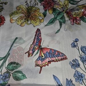 Vibrant floral print scarf with a pink border. Features colorful flowers and butterflies.