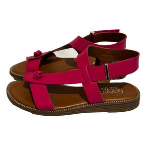 Like new only sign they have been worn is on the bottom sole The product is a stylish pair of Franco Sarto asymmetrical flat leather sandals in a fuschia pink color, designed for travel and casual occasions. These size 6.5 sandals feature a solid pattern, adjustable strap closure, and a comfortable flat heel. The open toe design and espadrille style make them versatile for all seasons, while the leather material ensures durability and quality. Perfect for women looking for a fashionable and practical footwear option.