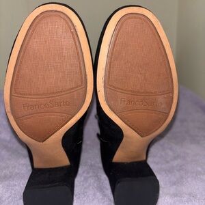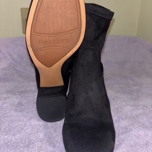 Elevate your style with Franco Sarto's black heeled boots, featuring a sleek design and a textured sole for added grip. These boots combine elegance and functionality, making them perfect for both formal and casual occasions. Crafted with attention to detail, they offer a comfortable fit and a sophisticated look.