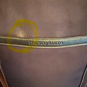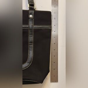 This Franco Sarto shoulder bag is a versatile piece that can be worn on any occasion, from travel to workwear. The black nylon exterior is complemented by silver hardware and a faux leather strap. The bag features a zip closure and pockets inside for added convenience.