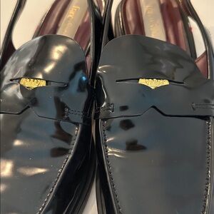 Sleek black patent leather loafers with gold buckle detail. Heel height 2 inches.
