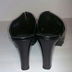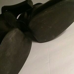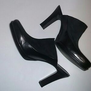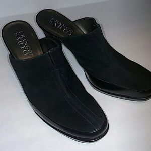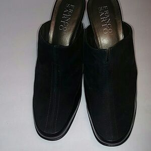 Franco Sarto Black Suede Mule size 10 4" block heel and 1/2" platform. beautiful suede with leather trim. Very little signs of wear on upper but some signs of wear on sole.
