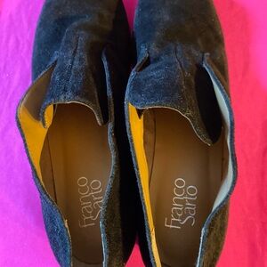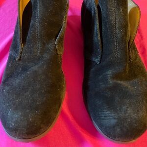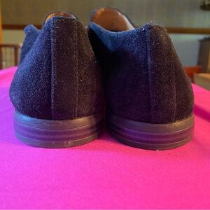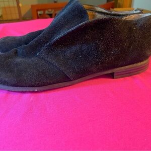 Stylish black suede loafers with a sleek design. Rubber sole for safety & comfort. Elastic at sides of tongue for easy entry.