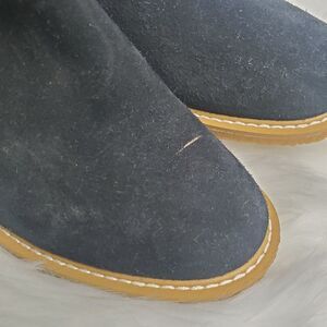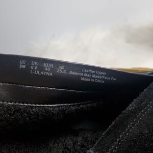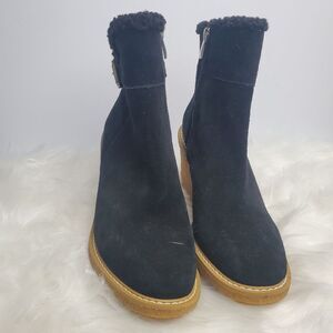 Features: Stylish black suede wedge booties with faux fur trim and side buckle detail.