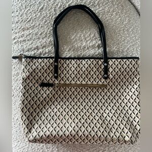Stylish tote with a unique geometric design. Features durable black handles. Perfect for everyday use.