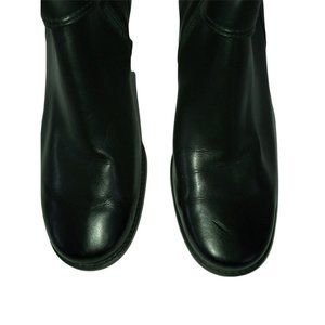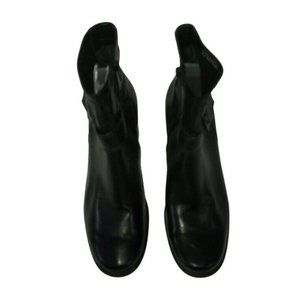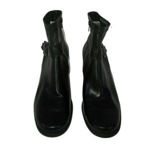 Franco Sarto black ankle boots with chunky "wood stack looking" block heels. They are all man-made of a stretchy fabric that looks like leather. There is a strap on each boot with a buckle closure. Inside zippers. Women's Size 10 M. Overall excellent condition. There is a small dent line in the front from something being stored on top of it but I imagine it will work it's way out. These were my personal boots so I know that I rarely wore them.