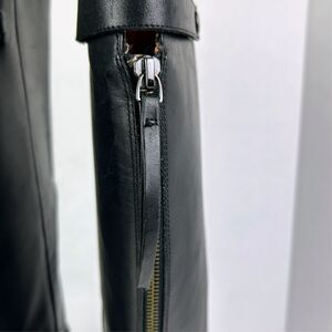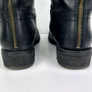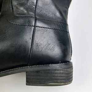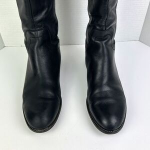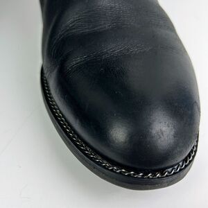 Franco Sarto Brindley Knee High Black Leather Riding Boots with Chain Detail. Theseclassic knee high or under the knee riding boots feature a subtle yet edgy chain trim around the footbed for a moto meets equestrian vibe. Back zipper closure with leather pull tassels and top stud snap strap. Rounded almost toes, low stacked heels. Women's size 11, approximately 1.5" heel, 18.25" shaft height. Good used condition - final photos show scuffs to leather at side of heel and back of block heels.
