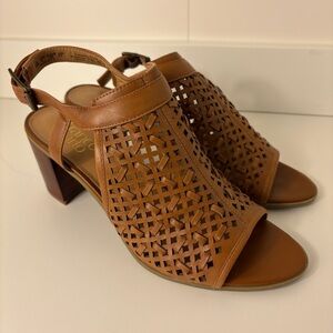 Elevate your style with Franco Sarto's tan heels, featuring a sophisticated woven leather upper and a comfortable medium-height heel. The peep-toe design and ankle strap add a touch of elegance, making them perfect for warm weather occasions.