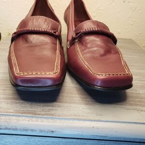 Step into sophistication with Franco Sarto's burgandy heels, crafted from high-quality leather for a refined appearance. These slip-ons feature a timeless design, making them ideal for both formal and business casual occasions. Enjoy the perfect blend of style and comfort with every wear. The heels are about 2". Shoes are in good condition.