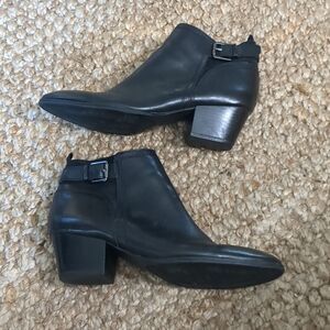 Franco Sarto • Golda Black Zip Booties Side Buckle Size 10. Outside Leather, Soles, Heels Excellent. Some wear inside Leather Pictured.