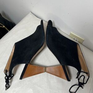 Cute suede upper with a 3.5 in stacked heel. Tie back and a peep toe make these perfect for spring. Suede does show some rub wear at the edges. Wood of the heel does show some roughing up. Please see all pix.