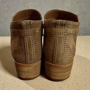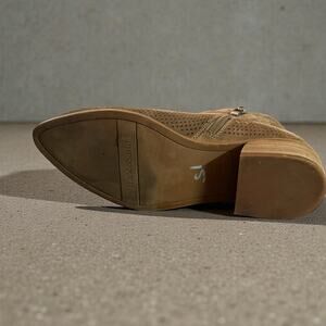 pair of Franco Sarto Dakota ankle boots (or booties) in a tan/brown suede finish. This specific style features a perforated upper, a side zipper, and a block heel.