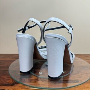 A slender strap secures your ankle in a statement-making sandal lifted by a towering block heel and platform.