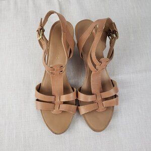 Franco Sarto Dare Nude Leather T-Strap Open Toe Wedge Sandals Womens Size 10