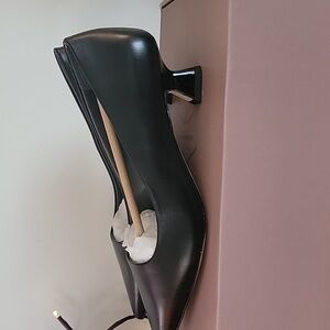 Sarto (Franco Sarto) Diva kitten heel pumps, color black, size 6M, New with box. Slip on style made of soft smooth leather by Italian designer Geonata Pagni. They feature a pointed toe and 1.75" heel. Never worn, comes with box and all packing. Note: there is a small scuff on one shoe, see photo. It really is not noticeable the flash of the camera makes it look more noticeable than it is.