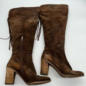 Franco Sarto Elnora Brown Suede Over the Knee Block Heeled Boots w/Tassel Trim at Back. Zipper on the inside near the ankle. Lined in tan. Small wound on the suede above the heel. See last picture.