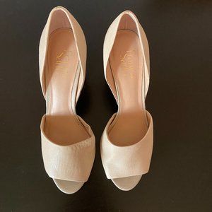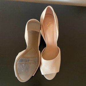 The perfect neutral pump - cream colored leather with stacked wood heel. Sophisticated peep toe style that could work for transitional seasons. In very good condition with 3" heel. Slight wrinkle in leather on toe of one shoe (pictured) but is not noticeable when worn.