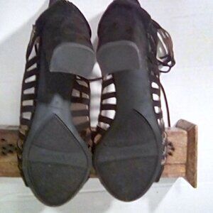 EUC! Like Brands New. Faux suede. Zips in back. Ties in front. 3.5 inch heel. I’m usually in between a 8.5/9 and these would be a little tight on me so they would fit a true 8 perfectly. Black metal tie ends