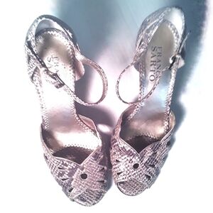Franco Sarto Faux Snakeskin Wedged Sandals. Peep toe. Scuffs on the wedge of both shoes. The edging of the front of one of shoes has wear. The right shoe the strap with the buckle is a little stretched. Gently used.