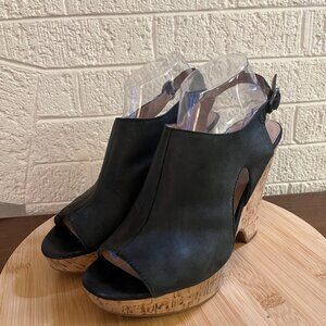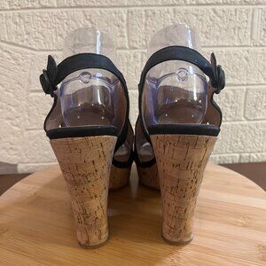 Franco Sarto Gabriel Black Peep Toe Leather Slingback Cork Heel Size 9.5
