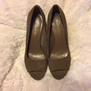 Excellent condition, only worn once. Beautiful soft suede with a thick heel (great for balance and comfort) and peep toe. Only a couple dark marks as shown in photos.