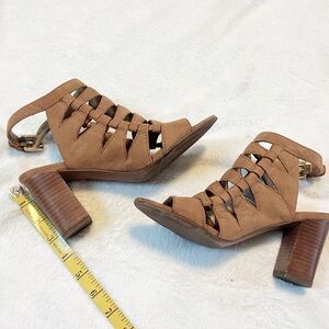 Franco Sarto Grady Faux Suede Stacked Heels Sandals Camel Tan Size 6 Open Toe