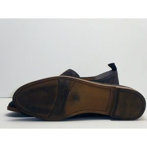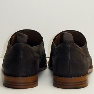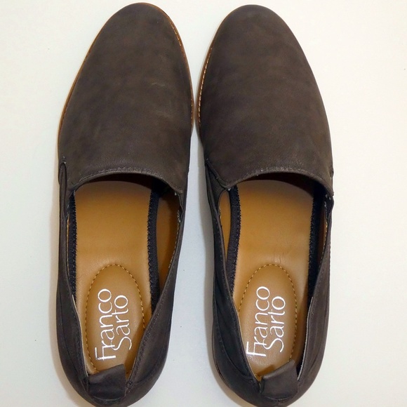 Stylish and comfortable slip-on loafer/flats. Heel is 1/2" or less. They look great with pants or a dress/skirt. Nice enough for office/going out, but can also be dressed down for a more casual look. Very versatile! I only wore them twice, so they are practically brand new. They were one of my pricier shoes, so I stored them in their original box. The cover photo captures the true color, dark grey. True to size.