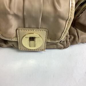 Franco Sarto Handbag With Coin Purse And Strap. The bag itself is in mostly good condition. It has 3 spots of stains on it. This has 4 exterior pockets, 1 main compartment and 4 inner pockets. This bag measures 16x10”. The handles are 7.5”L and the strap is adjustable.