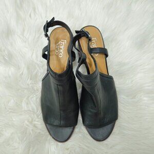 Franco Sarto Sling Back Buckle Black Leather Open Toe Shoes gently used but overall great condition. Has some minor little loose stings but nothing major. Very subtle scuffs on the heels. Functional buckle closure with comfortable stretch.