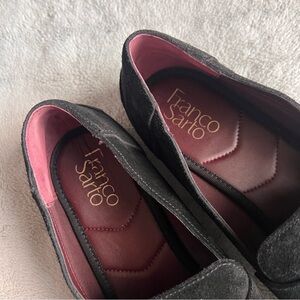 Good used condition. Jolie Loafer by Franco Sarto in solid black. Minimalist dark academia aesthetic, a capsule wardrobe staple piece. Flat suede leather loafer with kiltie tassel fringe detail, see video. Round toe and low block heel. Note: light wear with streetwear to bottom sole, faint discoloration/red marking to upper & scuffing and fading to upper, see photos. Size 9, see photos for measurements.