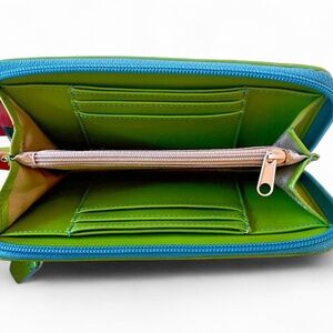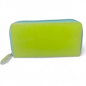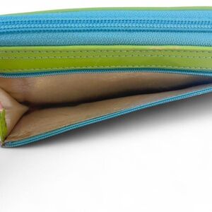 This timeless leather wallet in fresh green and light blue features an exterior zip pocket, interior center zip pocket, 9 credit card slots, and 2 bill slots. Interior like new. ome Slight rubbing along corners and trim. Please review all photos.