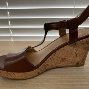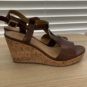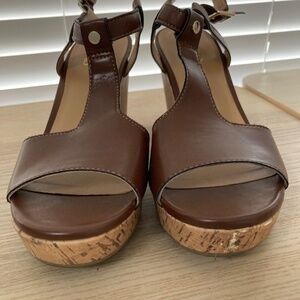 Brown platform strappy sandals. Slightly scuffed on left toe as shown in photos.