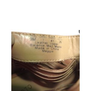 Tan strappy 4 1/2 inch heel. Has a little wear on bottom of shoes, a couple of indents around the foot beds, nothing that is noticeable, shoes are in otherwise gently used condition.