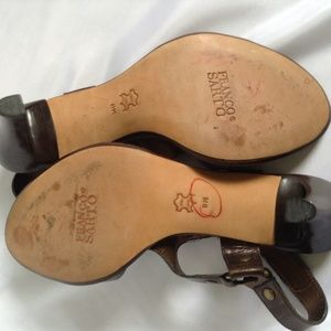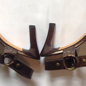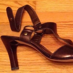 Ankle strap loops through metal ring and fastens by velcro. Soles are leather and have the "Vero Cuoio"