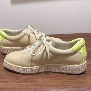 NWOT Franco Sarto Quinn sneakers in lemonade & off white leather. Eco conscious design plus Italian craftsmanship. Napa leather, eco conscious soft, comfortable linings, round toe, lace up front, contrast detail at heel, insole foam crafted with natural algae based bloom EVA, outsole crafted with plant based materials.