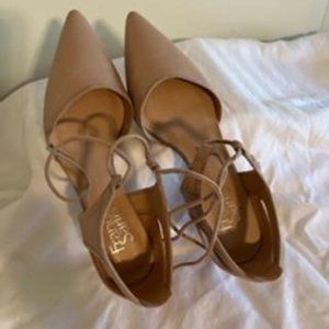 Fanco Sarto nude leather pump style shoe that ties with suede 2-1/2" heels. Great work shoe that goes with so many outfits. I wore these only a few times so they are like new. No box. Smoke free home.