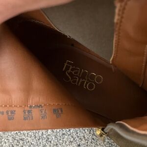 Timeless Franco Sarto olive ankle boots. Beautiful sophisticated western wear with Suede finish, stacked heel, pointed toes, and elastic panel for comfort.
