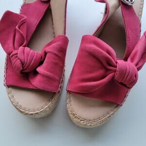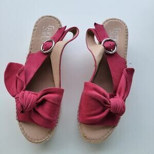 Franco Sarto Pink suede wedge sandal Peep toe Adjustable buckle slingback strap closure Suede construction Knot detail at vamp Woven jute wedge platform heel Approx. 2" heel, 1.5" platform Fuchsia pink