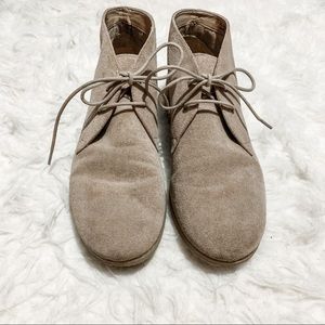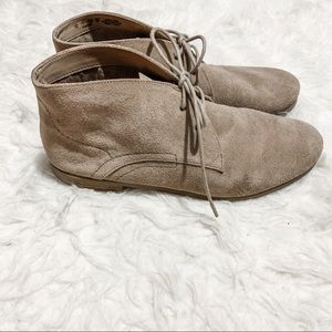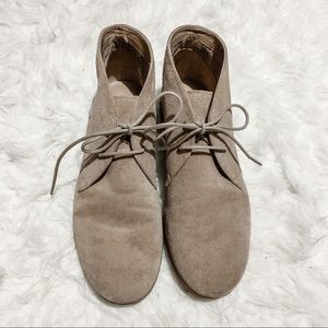 Tan suede leather bootie with two eyelet lace up.