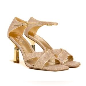 A sculptural heel punctuates a versatile dress sandal elevated by a squared silhouette.