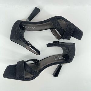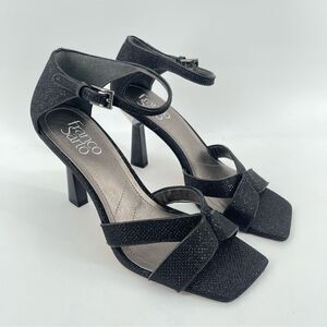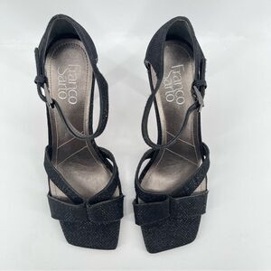 Franco Sarto Rania Women’s Metallic Black Ankle Strap Open Toe Sandal Heels Size 7