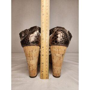 FEATURES/ACCENTS: Ultra high Cork wedge at 4", Adjustable buckle strap closure, Espadrille style, Reptile/Snake print, Open Toe, Side cutouts